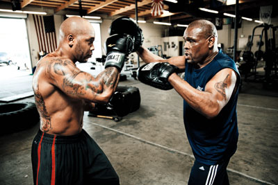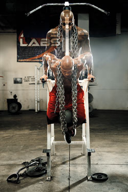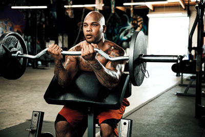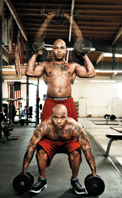 Flo Rida doesn’t just Flow with the rhymes, he Flows with his workouts, too. Under the watchful eye of trainer Tony Bradham (a former pro boxer and sparring partner for Lennox Lewis), Flo’s routine is more like a freestyle rap than a scripted song. Bradham’s program strings together traditional exercises plus ones he’s developed himself. the workout is a kind of giant whole?body circuit that com? bines compound and isolation lifts with novel plyometric moves, coupled with boxing training. “I make him work,” Bradham says. “If he’s cursing at me during the workout, then I know I’m doing my job.” “It’s brutal,” Flo adds. “We don’t let up—not for a minute. We’ll go like that for an hour and ten minutes straight.”