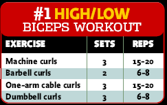 People tend to do virtually the same number of reps in all sets for a bodypart. If they do both high and low reps, they will typically segregatethose sets into a "light" day and a "heavy" day. But why not do them on the same day? Alternating sets or exercises for high reps (12-20) with those done for low reps (six to eight) is an excellent way of targeting fastand slow-twitch fibers and increasing both blood volume and strength. Starting with a high-rep machine exercise, as in the sample routine provided here, allows you to safely warm up for the heavy free weights that follow.
