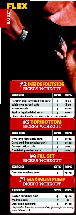 #5 | HIGHER UP A maximum biceps pump is among the most satisfying feelings you can experience in a gym, and many trainers find that their arms respond especially well to blood-volumizing workouts. The best way to pump up the blood is with higher reps; intensifying techniques, such as drop sets; and a rapid pace (less than 45 seconds between sets). As prescribed in "The Big Pump", you may also want to increase your carbohydrates before workouts and use supplements, including arginine, creatine and citrulline.