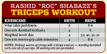 TRIÂING HARDER To observe Shabazz in the gym is to see the stark reality of how much hard work it takes to go from a 132-pound bag of bones to a 220-pound professional bodybuilder. On this day, I catch his Saturday routine, an arm workout, with 225-pound 2005 NPC National heavyweight champ Rowe. Shabazz hits a dumbbell rack first. ÂTo warm up my triceps, I warm up my biceps, he explains. ÂTriceps training is extremely heavy, much heavier than biceps work. When IÂm doing biceps, I usually start sweating a little bit; that warms me up for tris. Fair enough  but the Âwarm-up could just about cause a meltdown. ItÂs a set of standing dumbbell curls consisting of 40 pounds for 20 reps, 35 pounds for 30 reps, 30 pounds for 40 reps and 25 pounds for 50 reps. ThatÂs all one set  no rest. ÂThat gets me going, Shabazz proclaims like itÂs nothing. HeÂs just getting started.