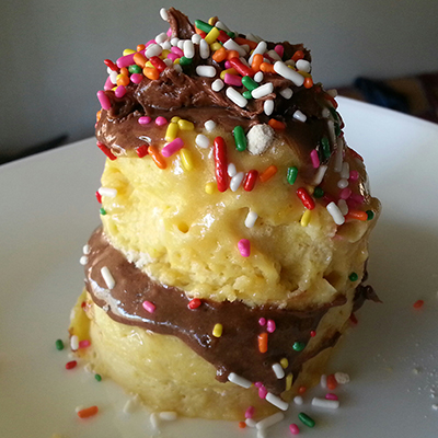 Place all cake batter ingredients in a coffee mug or a small bowl, and mix using a fork. Place in microwave and heat on high for 45-60 seconds. (Be sure to watch cake as it rises in mug so it doesn’t overflow.) Remove from microwave, let cool for a minute before topping with JIF whip. Top with sprinkles, if desired.
