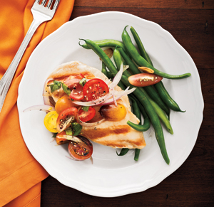Directions: Combine onion, tomato, basil, salt, pepper, oregano, garlic, and oil. Mix well, cover, and refrigerate. Grill chicken breast until center reaches 1600. Meanwhile, steam green beans. Top chicken with tomato mixture and serve alongside green beans, tossed with garlic and oil.