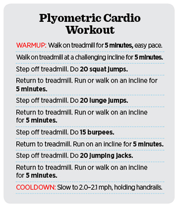 Why it’s Her Fave: “Injecting some plyometrics into your cardio program allows you to quickly boost your total calorie burn. I usually follow this routine with some superset ab exercises to work my muscles hard in a short period of time.”