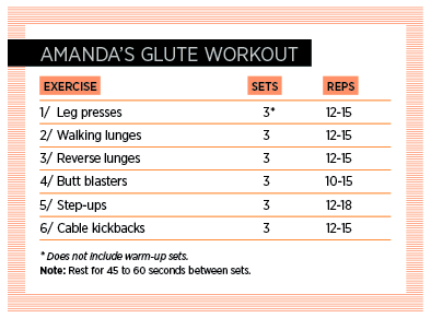 1. Use variety: “I change things up every time I train my glutes to keep things fresh. One workout I might do drop sets, the next maybe a different rep range—I’ll stick with five sets of each different exercise, usually pairing them as supersets.”