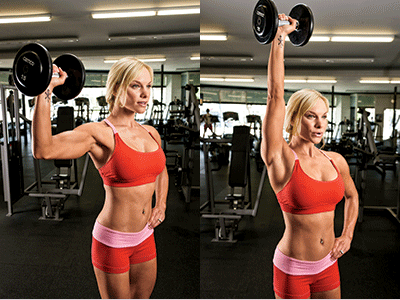 Get Ready: Stand erect and grasp a dumbbell in one hand in a comfortable press position close to your ear.