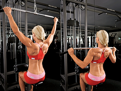 Get Ready: At a dedicated lat-pulldown machine, sit with your thighs under the pad and grasp the bar overhead.