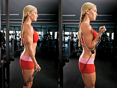 Get Ready: Attach a D-handle to a low-pulley cable. Grasp the handle in one hand and face away from the weight stack, standing far enough away that you feel tension on your biceps when your arm’s at your side.