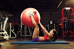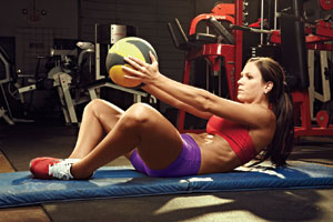 • Lie flat on a mat with arms stretched overhead holding a medicine ball.