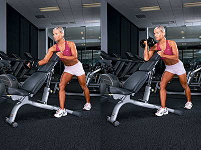 Start: Using a preacher-curl bench or an incline bench set to about 45 degrees, stand behind the bench and lean forward so your working arm fits snugly at the top, your triceps flush against the pad. Grasp a dumbbell with a supinated (palm-up) grip. Keep a slight bend in your elbow at the start.