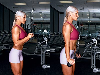Action: Flex your triceps and press the handle toward the floor until your arms are fully extended. Squeeze your tri’s and hold for a brief count before returning to the start position.