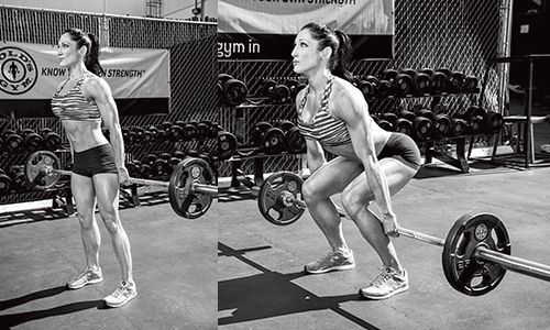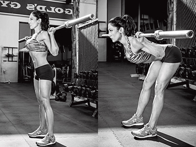 - Return to standing, pushing through your heels, until the barbell reaches the top of your hamstrings.