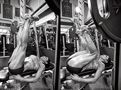 - Lie faceup on a bench under a Smith machine barbell (with safety arms engaged) with your hips in line with bar. Place the arch or middle of your feet on the bar with your feet hip width.