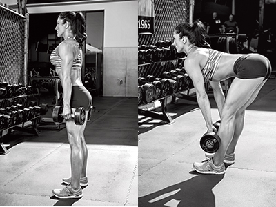 - Hold dumbbells with your palms facing sides of your thighs, feet 12 inches apart, and knees soft (not locked).