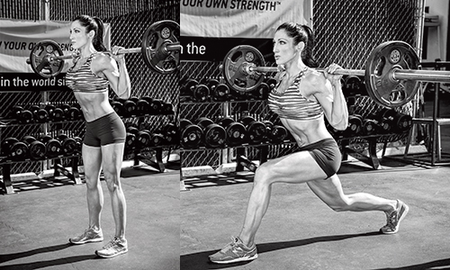 - Lift bar off the rack and take three steps back. Step to the rear with your right leg until your left knee is at a 90-degree angle.