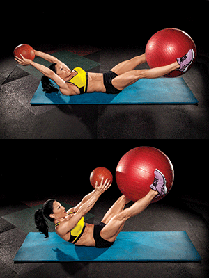 > Lie faceup on an exercise mat with a stability ball between your ankles, legs extended, and a medicine ball in your hands with your arms outstretched. Raise both balls about one foot off the floor.