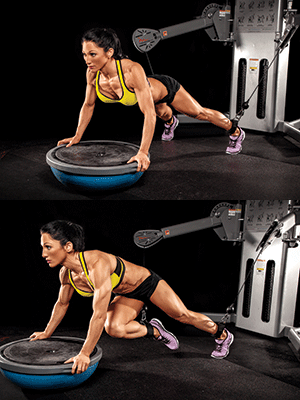 > Get in pushup position with your hands placed on a Bosu ball, flat side up, and feet slightly wider than hip width on the floor. Make sure there’s tension on the weight stack by walking forward slightly.