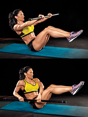 > Keeping your elbows slightly bent, rotate the Body Bar down to the side of your right hip. Repeat on the opposite side. That’s one rep. Perform two sets of 30 reps.