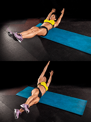 > Lie faceup on an exercise mat with a stability ball between your ankles, legs extended, and a medicine ball in your hands with your arms outstretched. Raise both balls about one foot off the floor.