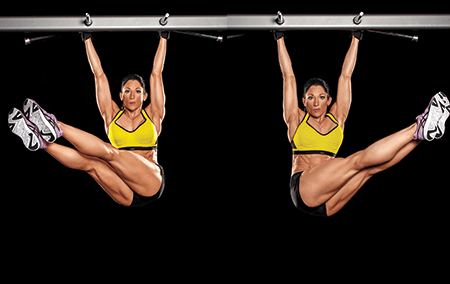 > Grasp a pullup bar with a neutral grip, palms facing each other. Keeping your legs together and straight, lift them in front of you until your feet are at chin level.