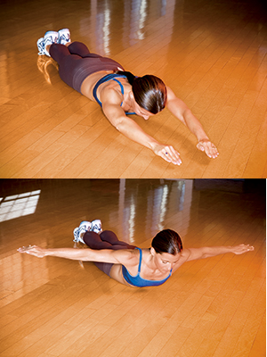 Movement: Raise your chest off the floor while moving your arms to shoulder level as if you’re flying. Return to the start position.