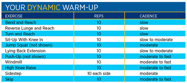 The following pages outline a dynamic warm-up routine that you can do before a full-body workout. It’s based on the U.S. Army research mentioned earlier. Keep your intensity level to a low-to-moderate level to prevent fatigue, which can be difficult since some of these movements are just plain fun to do. Now go warm up!