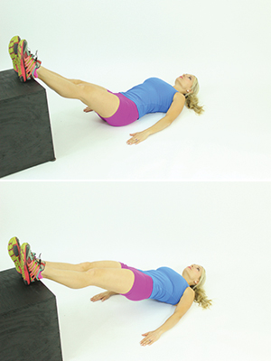How to do it: Lie flat on the floor with arms at sides, legs straight and feet resting on a box or a flat bench in front of you. Squeeze your glutes as you push your hips upward driving your low back and glutes off the floor. Pause, then slowly descend back to start.