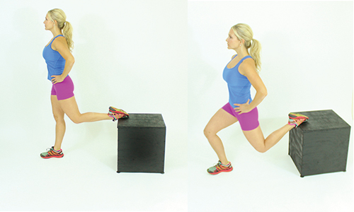 How to do it: Stand about 3 feet in front of a box or a flat bench. Raise your left foot and place it on the box behind you. Lower into a squat until your right knee is 90 degrees, keeping your knee in line with your ankle as you descend. Pause briefly at the bottom, then drive through your heel to return to start. Switch legs and repeat.