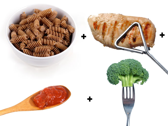 Choose whole wheat pasta with grilled chicken and broccoli (vitamins, nutrients) and add some marinara sauce for good flavor. The whole wheat pasta provides a good dose of carbs and the high protein, low fat chicken will also give you a charge.
