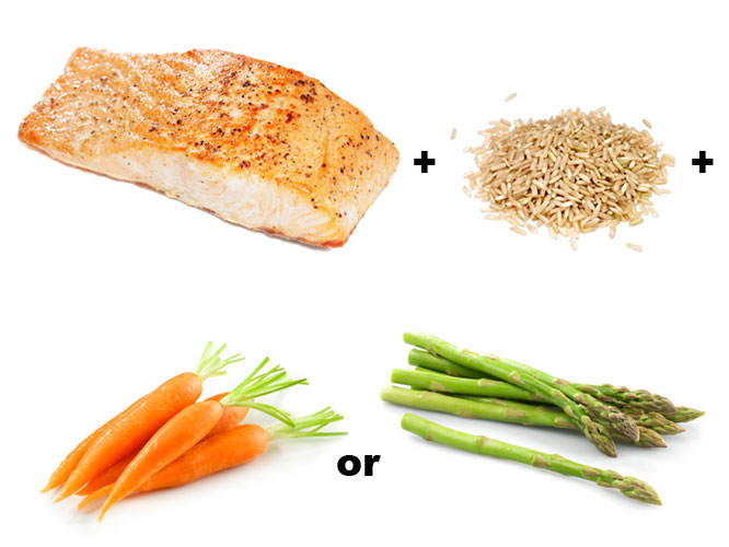 Grilled salmon filet with brown rice and a vegetable of your choice (steamed asparagus, steamed carrots, etc.) The quality of your meal is only as good as the condiments used though, so the brown rice should not be smothered in high-sodium soy sauce and your meats/fish shouldn’t be covered in mayo or fatty dressings.
