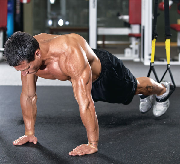 With your weight on your hands or on your elbows and forearms, and your feet suspended in the TRX, take a pike position and lift your glutes up. Keeping your core tight is the key to suspension training.