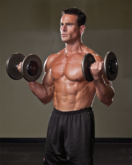 Don’t swing the weights up, fall backward, or shift side to side. Raise the weights in unison and hold at the top for one second.