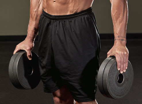 This simple grip-strengthening exercise provides balance between your overall arm strength and size. To do it, hold two plates together back-to-back with the smooth sides facing out for as long as you can without letting the weights touch your waist. Start with two 10s, then progress up.