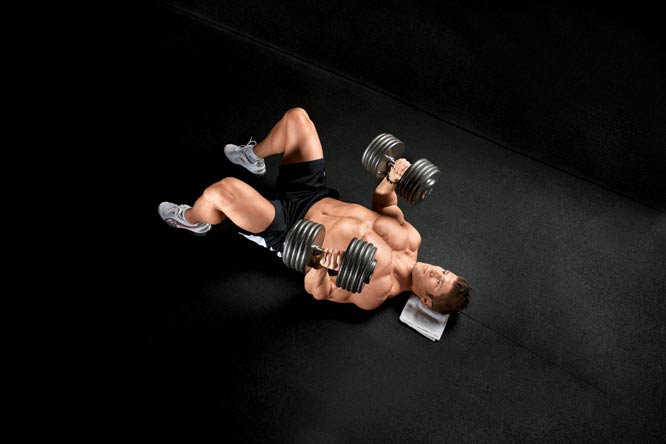 Lie on the floor with a pair of dumbbells. Press the dumbbells until they’re over your chest, lower, pause, then explosively repeat.