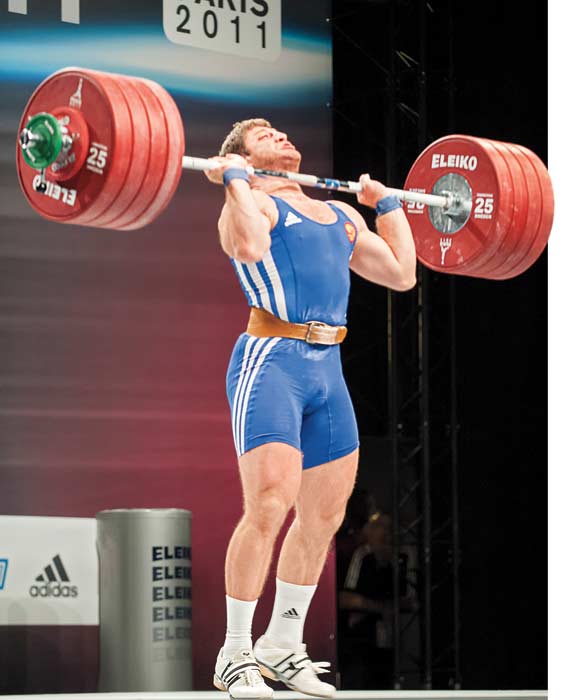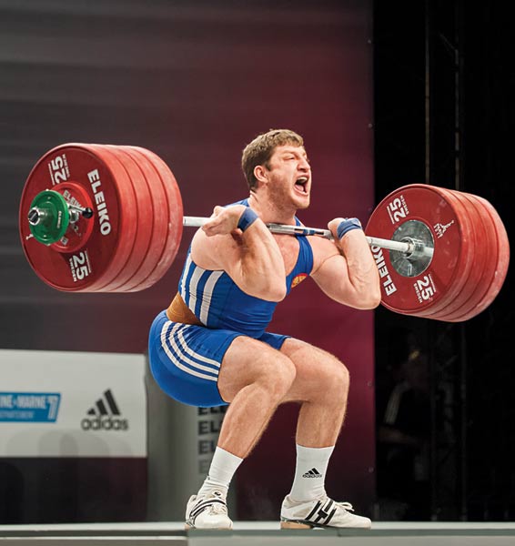 With your body now extended, shrug your shoulders and “pull” yourself under the bar, going into a full squat as the bar passes your chest. Thrust your elbows out in front of you, turning your wrists over and receiving the bar on top of your clavicles and deltoids.